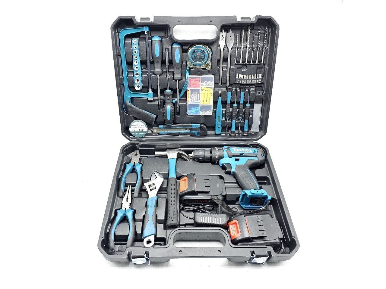 ✔ دارای کلیه ابزارهای مصرفی شامل؛ آچار فرانسه سایز۸، انبردست، دمباریک، چکش، بکس تک سایز ۴ تا ۱۳، متر ۳ متری، پیچ گوشتی دوسو و چهارسو سایز بزرگ، پیچ گوشتی نوک خور، مته آهن سایز ۵ و ۶ و ۸، مته دیوار سایز ۵ ،۶ و ۸، مته برگی سایز ۱۲ و ۱۶، ۹ عدد نوک پیچ گوشتی، تبدیل نوک پیچ گوشتی به بکس چسب برق، کاتر، فازمتر دیجیتال، آچار سه نظام، ۵ عدد تیغ کاتر، دو سایز پیچ گوشتی موبایلی دو سو و دو سایز پیچ گوشتی موبایلی چهارسو، کمان اره چوب و فلز، مجموعه سایزبندی پیچ و رولپلاک
